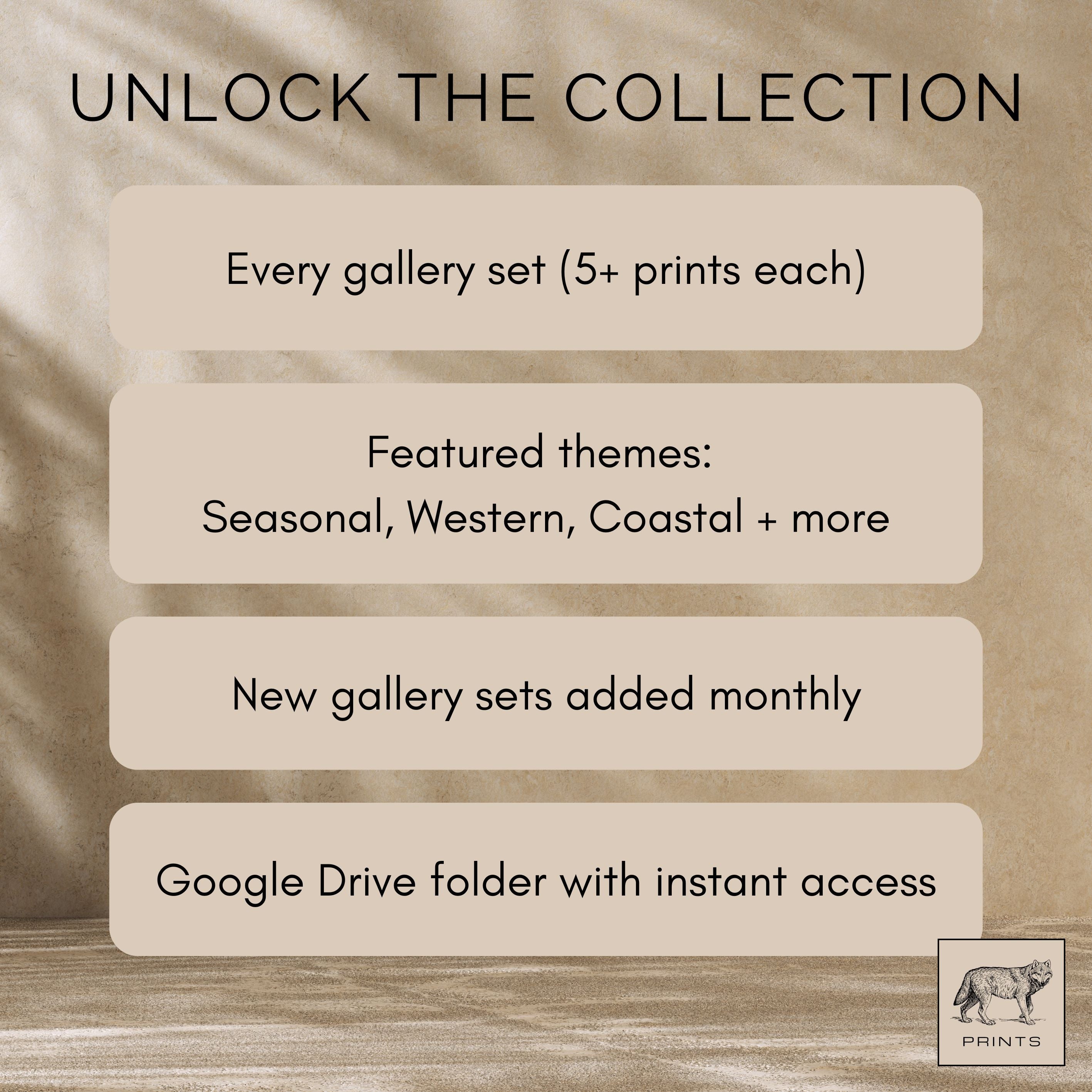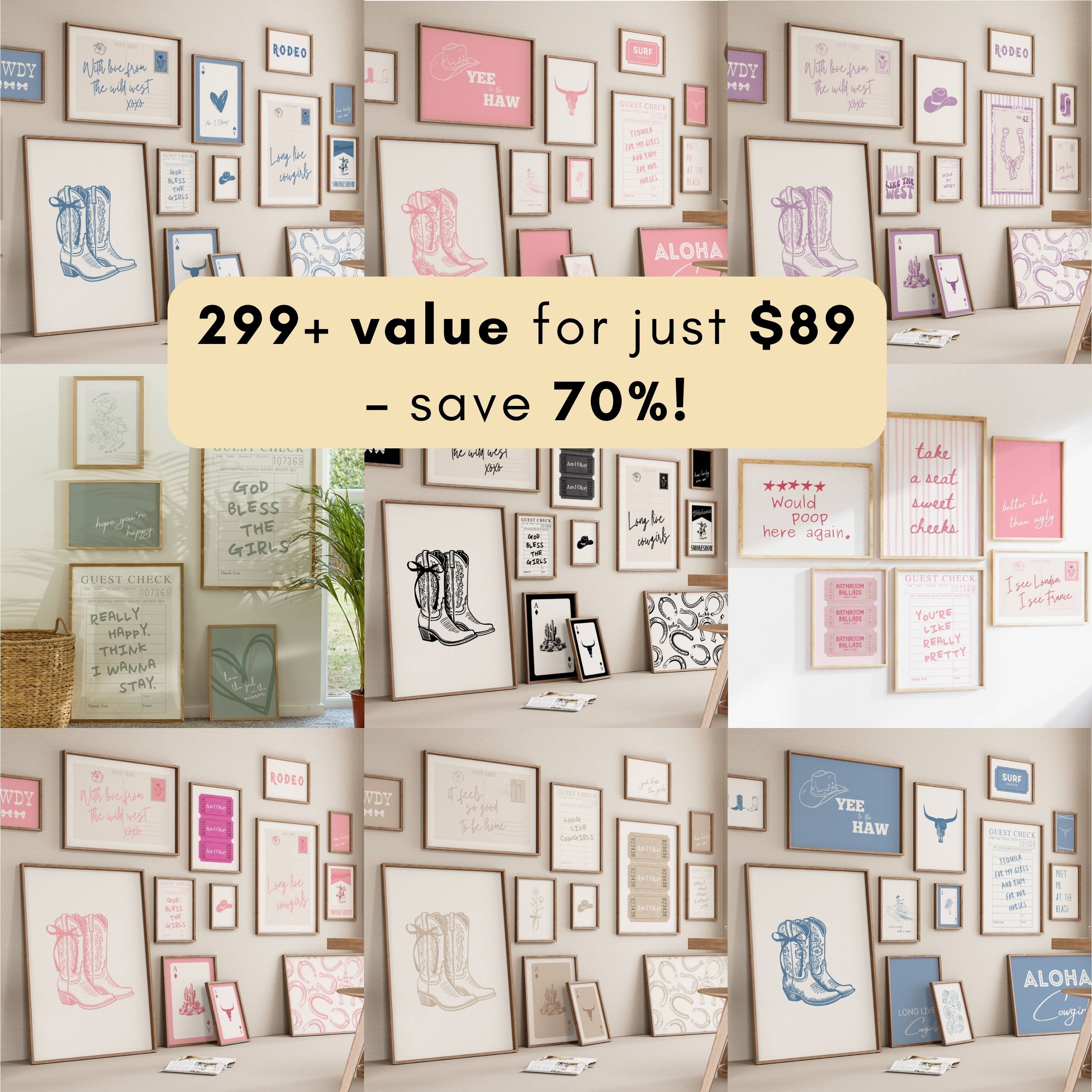 With this one-time purchase, you’ll receive a link to a private Google Drive folder containing all of my curated gallery sets including bestselling designs like western, coastal, seasonal, and more. — easy to download and print whenever you like.