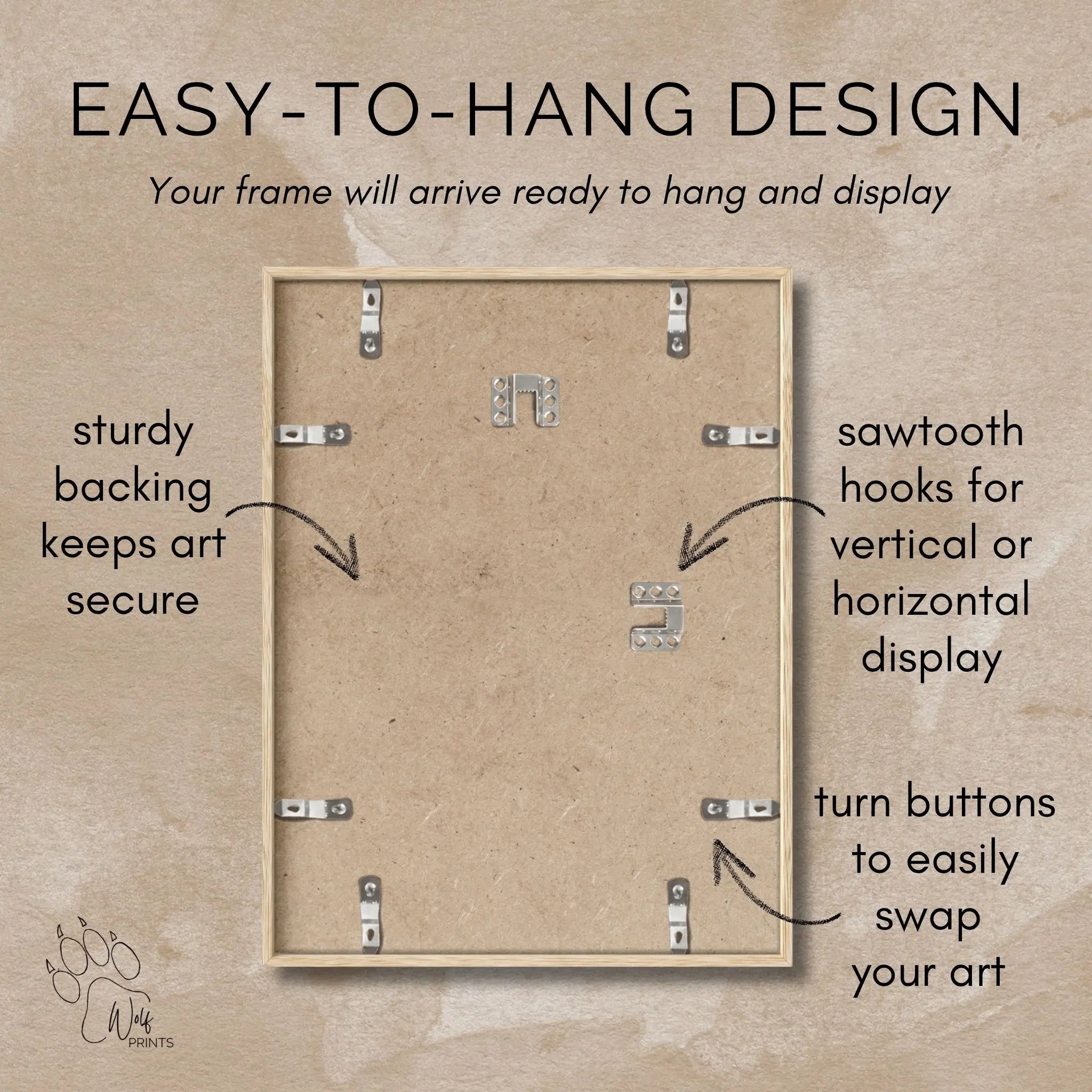 Frame Options: Natural Oak, Walnut Oak, Black Metal, Gold Metal — with durable plexiglass cover and sawtooth hooks for easy hanging